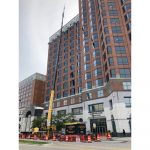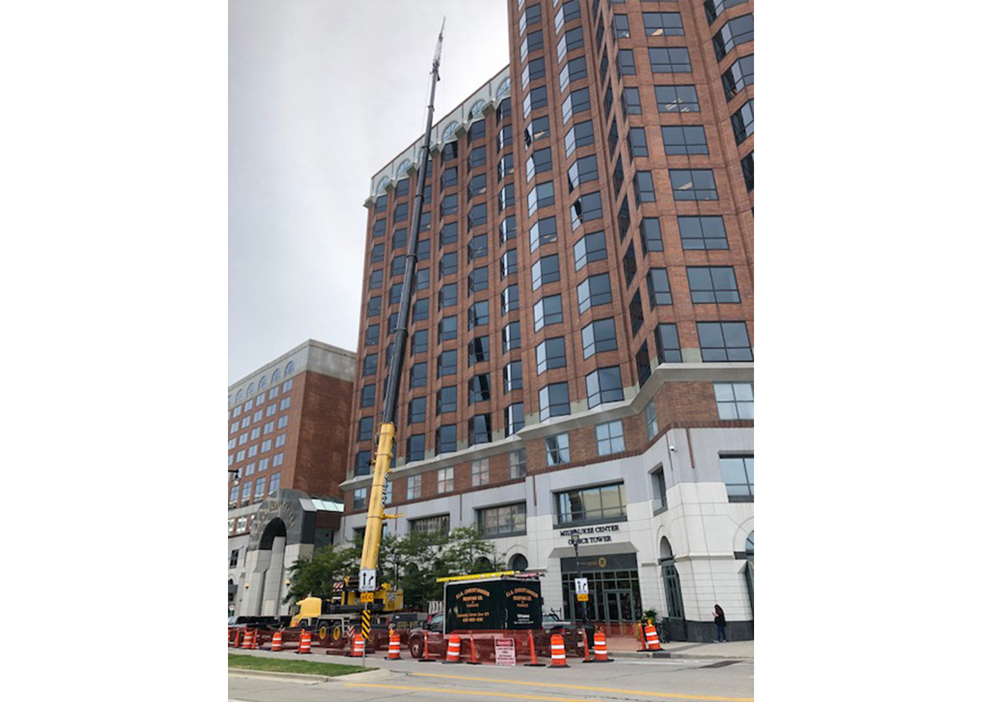 While FJAC is accustomed to access challenges relating to the staging of cranes and equipment at job sites, the Milwaukee Center project also had unusual balcony access issues, noted Sean Kocherer, FJAC project manager. Access to the corner balconies for crews and materials was through office windows – and only during off-hours when office tenants were not at work.