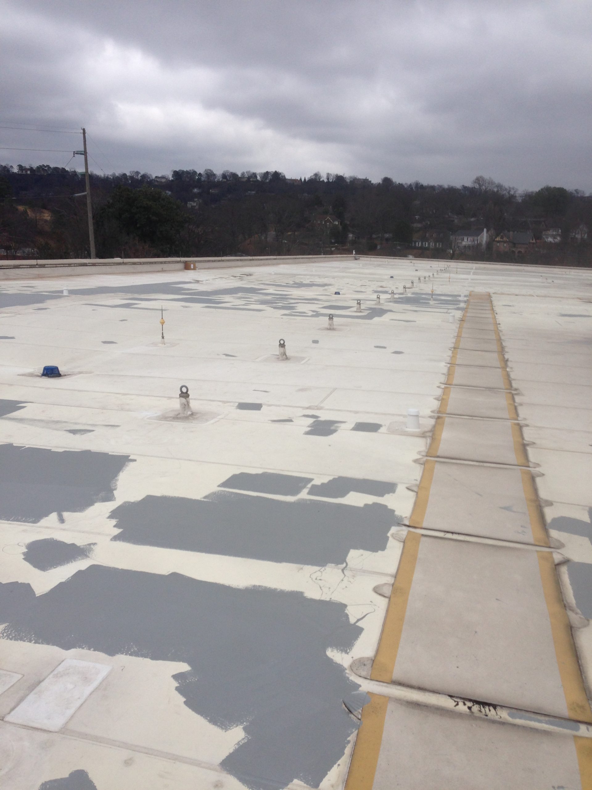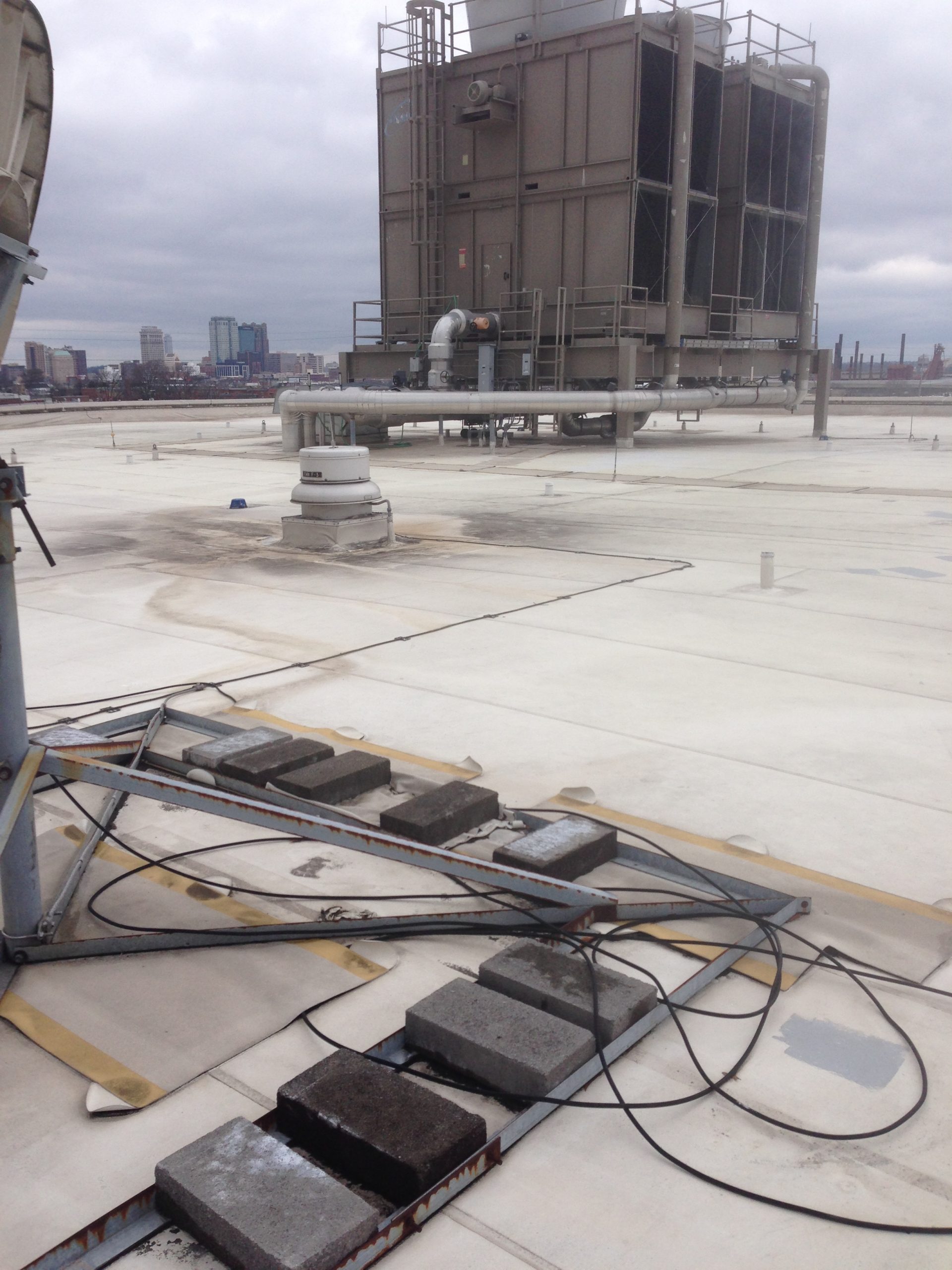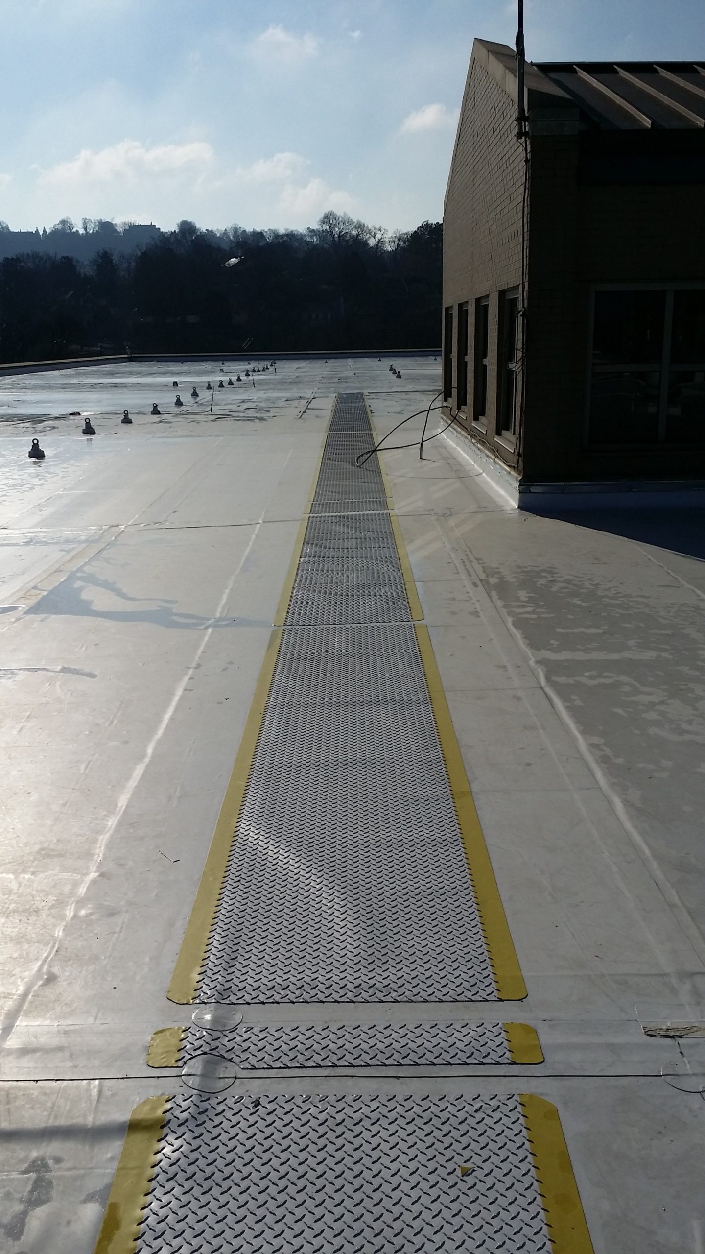 Lower parapet walls needed parapet safety clamps throughout the project. The use of ladders was forbidden during the project so the crews had to access the roof through the facilities roof hatch. Safety davits are in place throughout the roof.